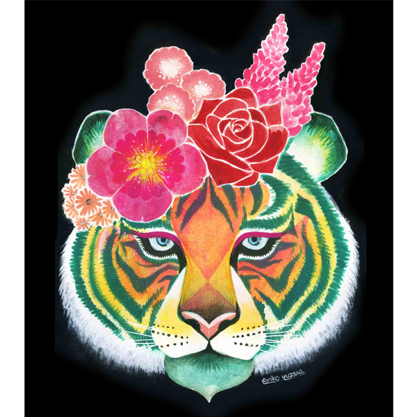 強くて美しいトラはよく好んで描きます。トラの模様は葉っぱに見立てて緑色。