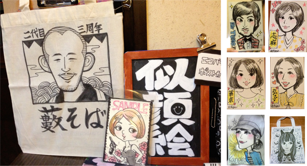 クラブ、バー、カフェ、お蕎麦屋、移動ピザ屋など、 様々な場所でのイベントに似顔絵屋として出張しています。 ご依頼、ご相談お気軽にお問い合わせください。 ライブペイントも可能です。 2010〜
